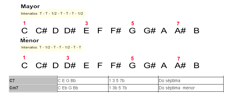 Para no perderte en como va cada grado, sigue los intervalos, Ejemplo Mayor ( T – T – 1/2 – T – ) T son dos tonos y 1/2 es un tono. Solo vemos hasta el quinto intervalo por que vemos triadas si no seguimos los tonos y semitonos de la escala.
