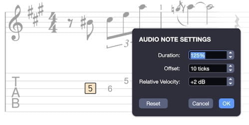 Personaliza la duración, el desplazamiento y la velocidad relativa de cada nota de tu partitura.