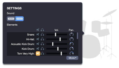 Ajuste el sonido de la batería y las pistas de percusión configurando el volumen y el panorama de cada elemento.