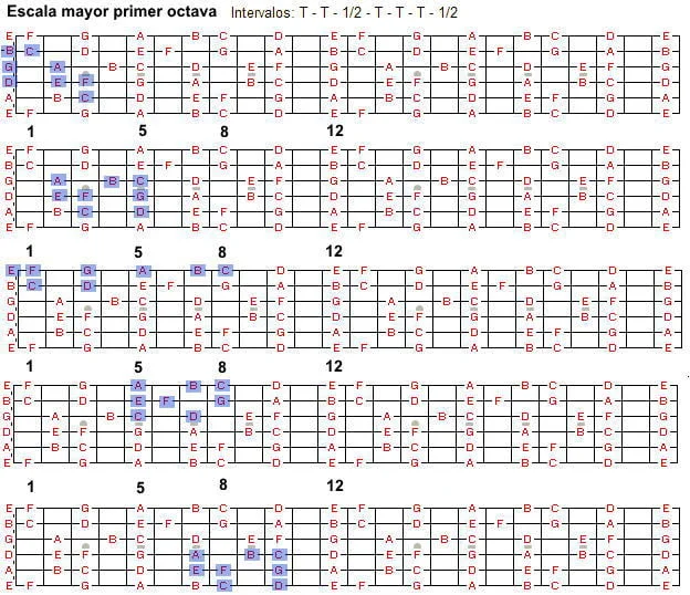 Las mismas notas que tocas del traste 0 a el 12 se repiten en la segunda octava a partir de el traste 12 que seria el cero una octava mas aguda.