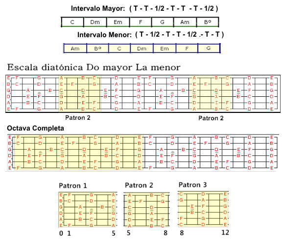 En esta lección vemos todas las tonalidades de la escala diatónica en imágenes, primero sus intervalos, luego las notas de sus grados mayor y menor, y en el diapasón de 24 trastes podemos apreciar el patrón 2 que nos dice la tonalidad mayor y menor en la que estamos.