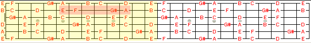 Tengamos en cuenta que esta es una escala menor, entonces cualquiera de las 12 notas que encontremos en la sexta cuerda nos dará la escala menor armónica, de ese tono que estemos pisando, ya que por sus alteraciones no tendríamos una escala mayor. Si tocamos las notas que están en rojo: los grados 5 6 7 y su tónica veras su sonido característico, ( notas E F G# A )