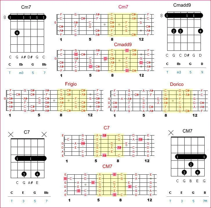 Sabiendo esto y lo que aprendimos en la lección 27 de: Escalas Simétricas, ya puedes improvisar cualquier acorde menor, mayor mas sus tensiones y con la lección 27 como hacerlos con los disminuidos y aumentados.