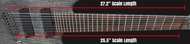 En lugar de que la guitarra tenga como normalmente una única longitud en todas las cuerdas por ejemplo 25.5′ en estas, cada cuerda tiene su propia escala, por ejemplo la primera 25.5 y va aumentando hasta que en la 8va cuerda tiene 27.2.